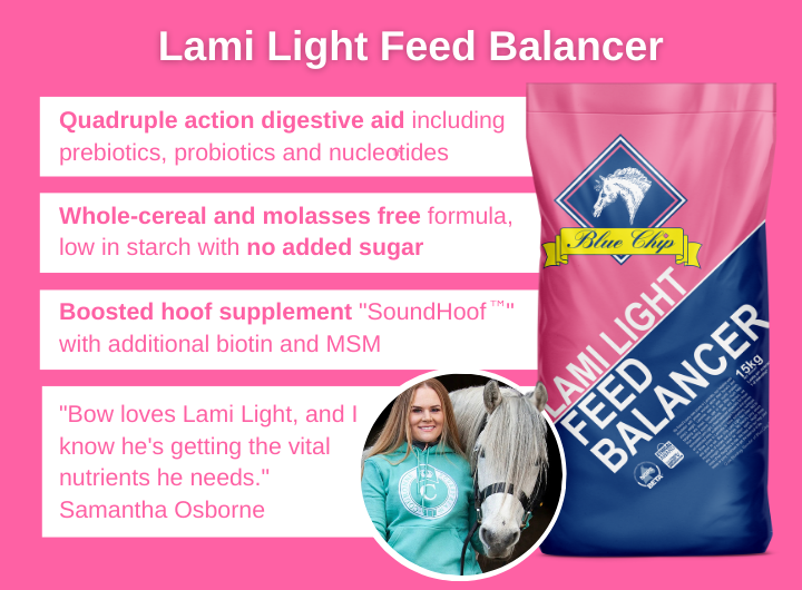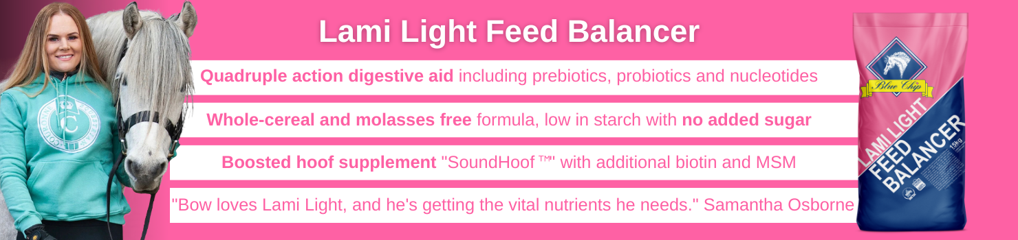 Blue Chip Lami Light is formulated specifically for those who are prone to Laminitis and for a wide range of good doers seeking weight management. Lami Light benefits from a quadruple-action digestive supplement, which helps promote the development and maintenance of a healthy digestive system, vital for those prone to Laminitis. Lami Light is naturally low in starches with no added sugar, AND free from whole cereals and molasses, making it perfect for all types of ponies and horses. Lami Light provides all the essential nutrients, vitamins, and minerals your horse or pony needs to maintain optimum health and well-being.