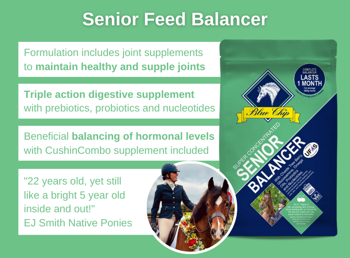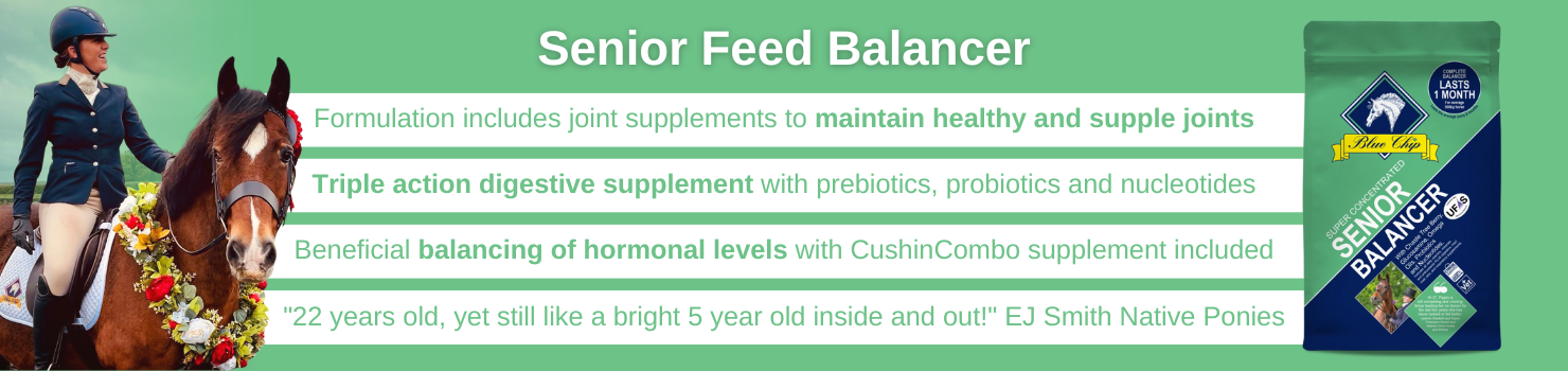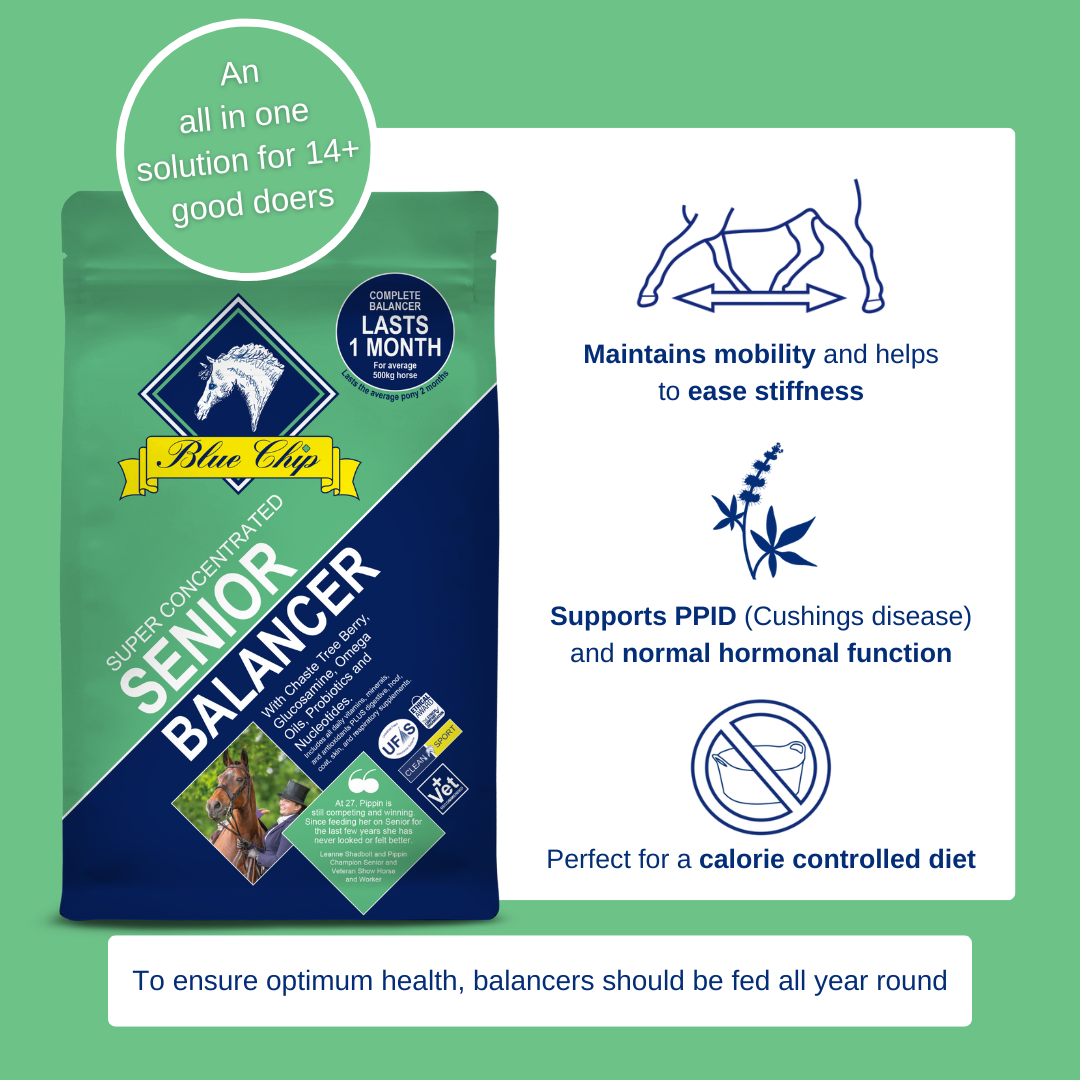 Nutritional profile - Senior contains a complete vitamin, mineral and nutrient package in a super concentrated format; this means daily feeding rates are as low as 50g. The nutritional profile has been carefully formulated to ensure the correct functioning of the metabolic system, central nervous system and immune system. Senior is balanced to help promote prolonged cartilage metabolism and joint health. Blue Chip uses organic/chelated minerals to ensure optimum absorption and effectiveness.